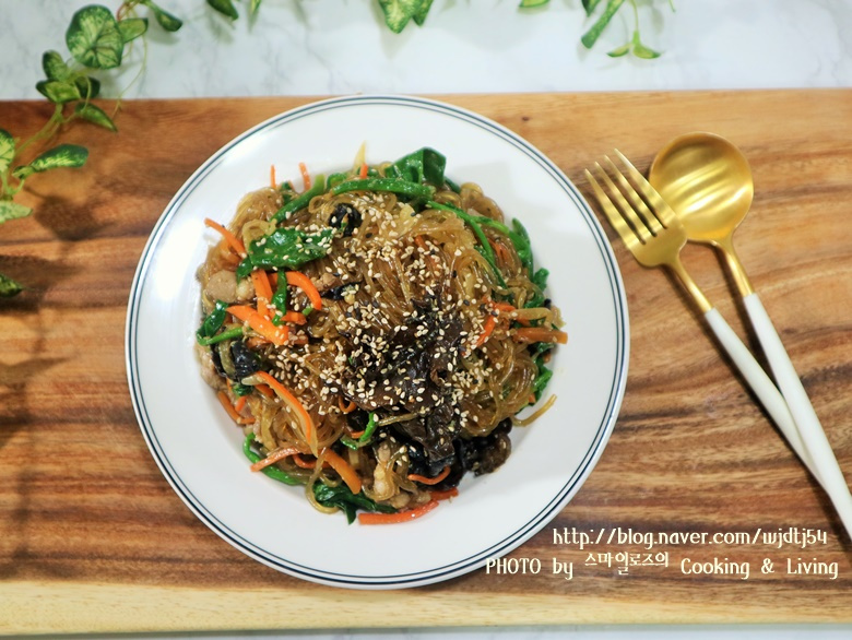 このように、野菜を別々に炒めずに一度に順番に炒め、春雨も茹でずに煮込み調味料で煮詰めてから加えると、思ったよりもずっと簡単に美味しいチャプチェが作れます。最後に炒りごまとごま油で仕上げればチャプチェの完成です!