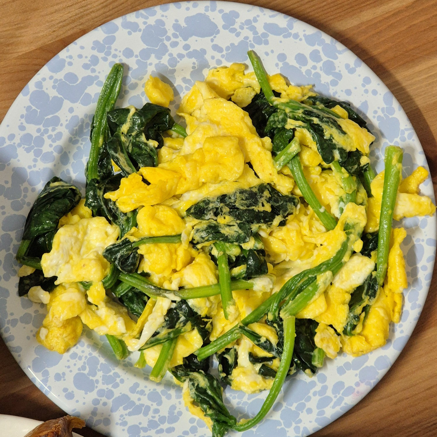 卵がふんわりと固まり、ほうれん草とよく混ざり合ったら、美味しいほうれん草と卵の炒め物の完成です!温かいうちに皿に盛り付け、召し上がってください。ご飯のおかずにも、パンと一緒にブランチとしても最高です。