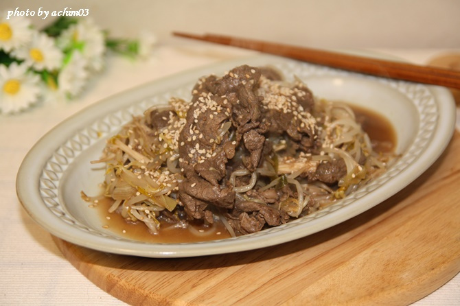 牛肉の表面の色が変わり、8割程度火が通ったら、準備しておいたもやしとエリンギ(またはしめじ)を加えます。野菜を加えたら、全体を素早く混ぜ合わせるように炒めましょう。野菜は炒めすぎると水分が出て食感が悪くなるので、お肉と一緒にさっと火を通すのがポイントです。全体が均一に混ざったら火を止め、美味しいプルコギの完成!熱々のご飯に乗せて、召し上がれ!