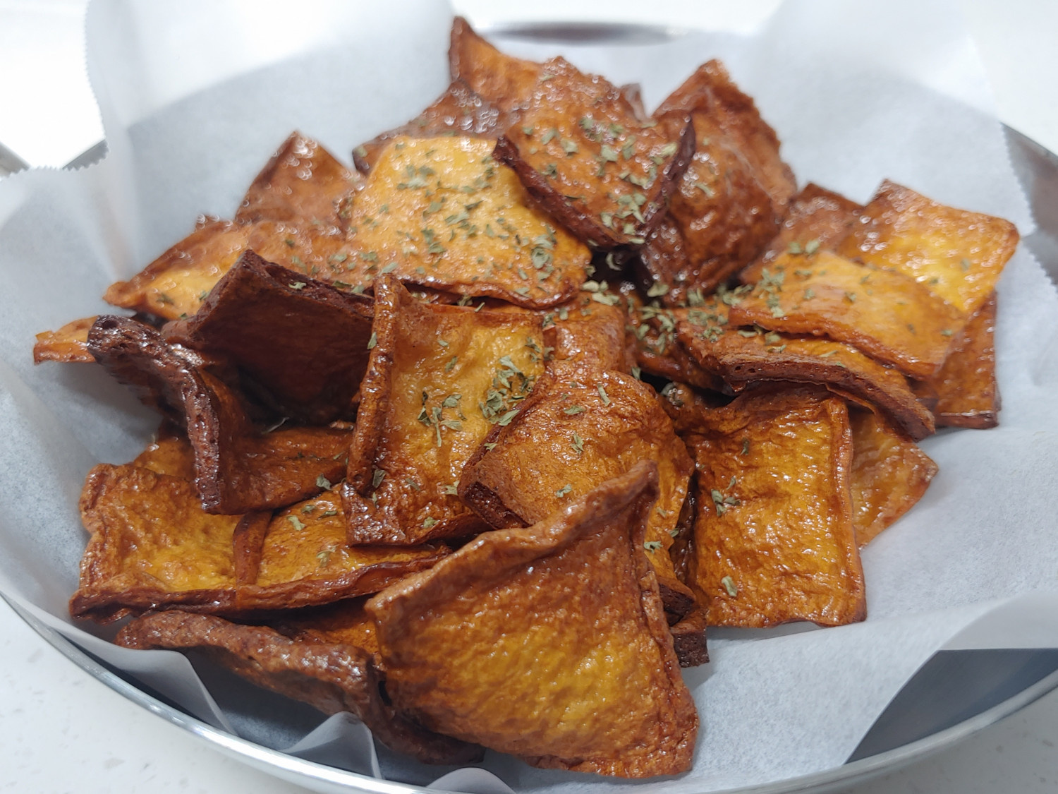 6分後、オーブントースターの網(またはエアフライヤーのバスケット)を取り出し、ちくわを一つずつ裏返します。すべての面が均一に焼け、美味しくなるように丁寧に裏返してください。