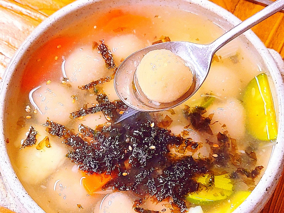 だし汁に十分な旨味が出たら、煮干し、昆布、玉ねぎ、干したスケトウダラなどの具材は全て取り除き、澄んだだし汁だけを残します。炒めたあさりを澄んだだし汁に加え、一緒に煮込みます。味見をして、もし薄ければ塩を少々加えて味を調えてください。ここでお団子状に丸めたオンシミを、一つずつそっと入れていきます。