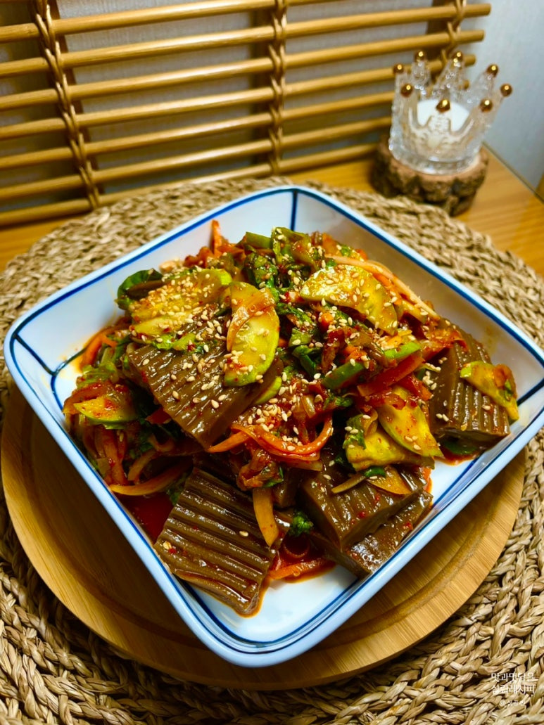 もちもちとした食感のドトリムク(どんぐりこんにゃく)は、それだけでも美味しい栄養満点食品ですが、美味しいヤンニョム(調味料)につけて食べるとさらに格別です。特に夏場は、さっぱりとした甘酸っぱいヤンニョムを作り、新鮮な旬の野菜と一緒に和えてみてください。ボリューム満点で美味しいドトリムク料理に大変身します。こうして作ったドトリムクの和え物は、ご飯のおかずとしても優秀ですし、ご飯と混ぜてドトリムクパプ(どんぐりこんにゃくのお粥)として食べれば、他のおかずがなくても満足できる一食になります。今日は、暑い季節に失われがちな食欲を刺激する、新鮮な玉ねぎとシャキシャキのきゅうりをたっぷり加えて和えた、美味しいドトリムクの和え物の作り方を、段階を追って詳しくご紹介します。
