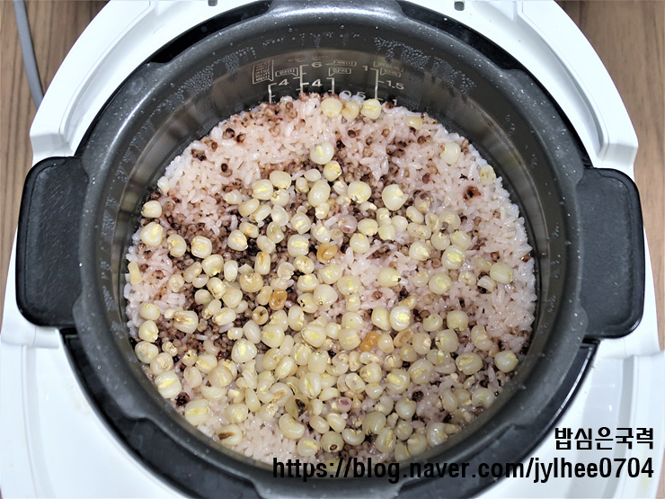 炊飯器の内釜に、洗ったお米を入れ、その上に浸水させたハトムギともちとうもろこしの粒を全て加えます。最後に、準備しておいたもちとうもろこしの浸水水とハトムギの浸水水を合わせた2カップの水を注ぎます。このように浸水水を使うことで、とうもろこしとハトムギの栄養を丸ごとご飯に閉じ込めることができ、より健康的で風味豊かなご飯を楽しむことができます。