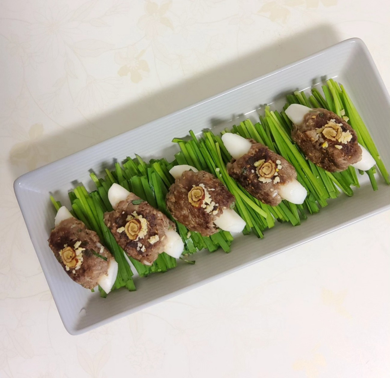準備したトッポッキ用のトッを生地の中央に入れ、肉だねでトッを包み込み、丸く平たいトッカルビの形に整えてください。トッがはみ出さないように、しっかりと包み込むのがポイントです。