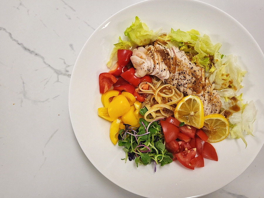 いよいよ、すべての材料を美しく盛り付ける段階です。ソースと和えたパスタの上に、新鮮なレタス、パプリカ、トマト、ベビーリーフ、そして薄くスライスした鶏むね肉を彩りよく盛り付けます。最後に、お好みでソースをさらに少量かけたり、白ごまを振りかけたりすると、さっぱりとして美味しいサラダパスタの完成です!どうぞ召し上がれ!