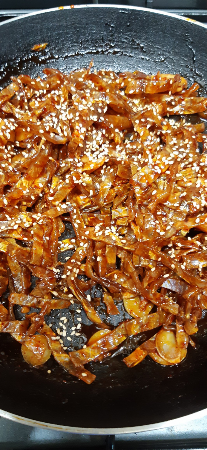 炒めた白身魚のフライを、煮立たせた調味料のフライパンに加えます。調味料と白身魚のフライを均一に絡ませながら、さらに1〜2分ほど炒め合わせます。最後に、ごま油少々を回しかけ、炒りごまを散らしたら、甘辛く chewy な白身魚のフライの炒め物の完成です!とても美味しいので、ついつい手が止まらなくなりますよ。