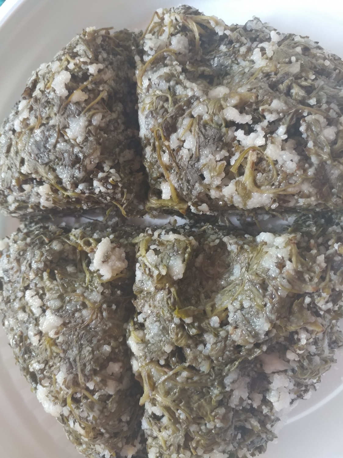 下処理をして水気を切ったよもぎ400gを、米粉のボウルに加えます。よもぎの風味をしっかり楽しみたい場合は、米粉と同じくらいの量か、それよりも多めに入れるのがおすすめです。手で優しく混ぜ合わせるようにして、よもぎと米粉が均一に混ざるようにします。少し生地を手に取って味見をし、もし塩気や甘さが足りなければ、塩やシュガーを足して調整してください。(アレンジ:茹でた大豆などを加えると、食感と風味がさらに豊かになります。もしあれば、ぜひ加えてみてください!)
