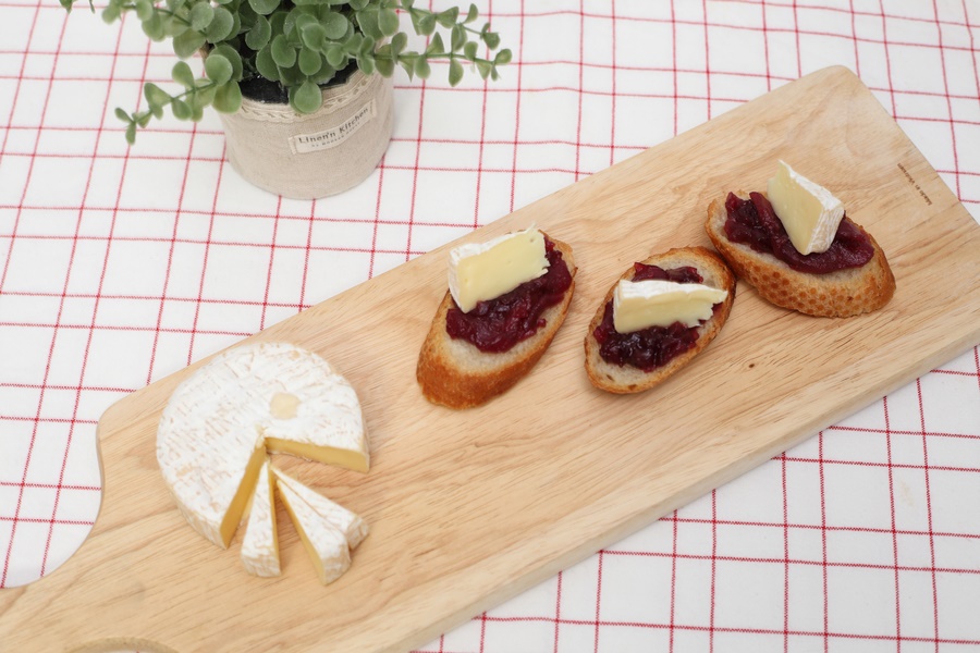 ブルスケッタ用のカマンベールチーズは、食べる約1時間前に冷蔵庫から出して室温に置き、柔らかくしておきます。白カビチーズは冷たいままだと風味が落ちます。室温で柔らかくするか、電子レンジでほんの少し温めると、風味が格段に増します。バゲットは食べやすい大きさに切り、軽くトーストします。トーストしたバゲットの上に、冷ましたりんごのコンポートをたっぷりのせ、柔らかくなったカマンベールチーズを食べやすく切って乗せれば、美味しいりんごのコンポートとカマンベールチーズのブルスケッタの完成です!甘くて香りの良いコンポートと、クリーミーでとろけるチーズの組み合わせは格別です。