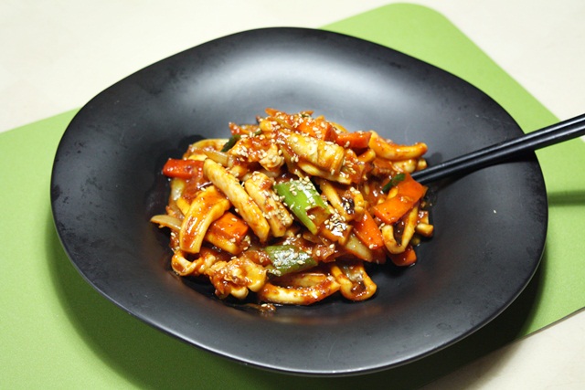 次に、下処理したイカと残りの合わせ調味料(だし汁、水あめ、塩)をすべて加えて、素早く炒め合わせます。イカは火を通しすぎると硬くなるので、強火で1〜2分程度、さっと炒めるのがコツです。イカが白っぽく色が変わってきたら、ほぼ完成です。お好みで辛さを増したい場合は、青唐辛子を追加したり、コチュカルの量を調整してください。