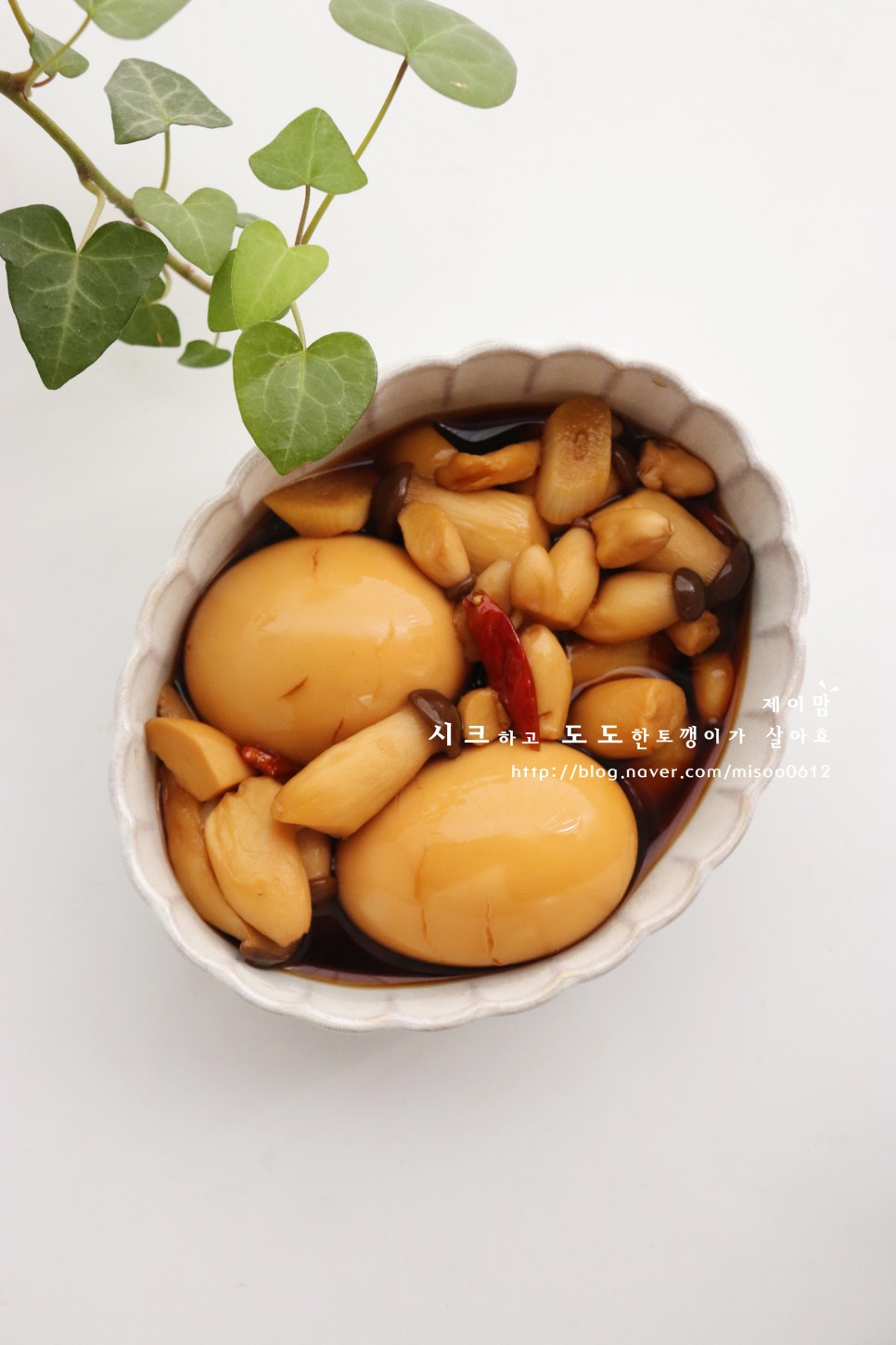 それでは、美味しい煮汁を作りましょう。鍋に水1カップ、醤油大さじ6、料理酒大さじ2、オリゴ糖大さじ1、砂糖小さじ1/2を入れ、よく混ぜ合わせます。ここに薄切りにしたニンニク3かけと生姜パウダー0.1小さじを加えて風味をプラスします。(お好みで、ピリッとした辛味が欲しい場合は、乾燥唐辛子1〜2本を一緒に加えても美味しいです。唐辛子は材料リストには含まれていませんが、お好みで加えてみてください。)全ての材料を入れた煮汁は、中火で沸騰したら弱火にし、軽く煮立たせます。