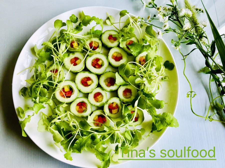 「プレストラン」で紹介されたキュウリのロールキムチに触発され、忙しい夕食時でも手軽に作れる「パプリカときゅうりのロールサラダ」にアレンジしてみました!キムチにしてもきっと美味しかったと思いますが、サラダとして楽しむことで調理プロセスも簡単になり、すぐに新鮮な状態で味わえるという利点があります。パリパリのキュウリと色とりどりのパプリカが出会い、見た目にも味覚にも素晴らしいサラダが誕生しました。庭から摘んだばかりの若いカブの若葉を添えると、さらにみずみずしさが加わり、豊かな印象を与えます。市販のベビーリーフを使っても大丈夫です。キュウリロールの美しく美味しい食感と若葉の新鮮さが組み合わさって、味と健康を同時に満たす素晴らしいダイエット食になります。お客様をおもてなしする際にも最適で、食卓に並べるだけで華やかで豊かな雰囲気を演出できます。