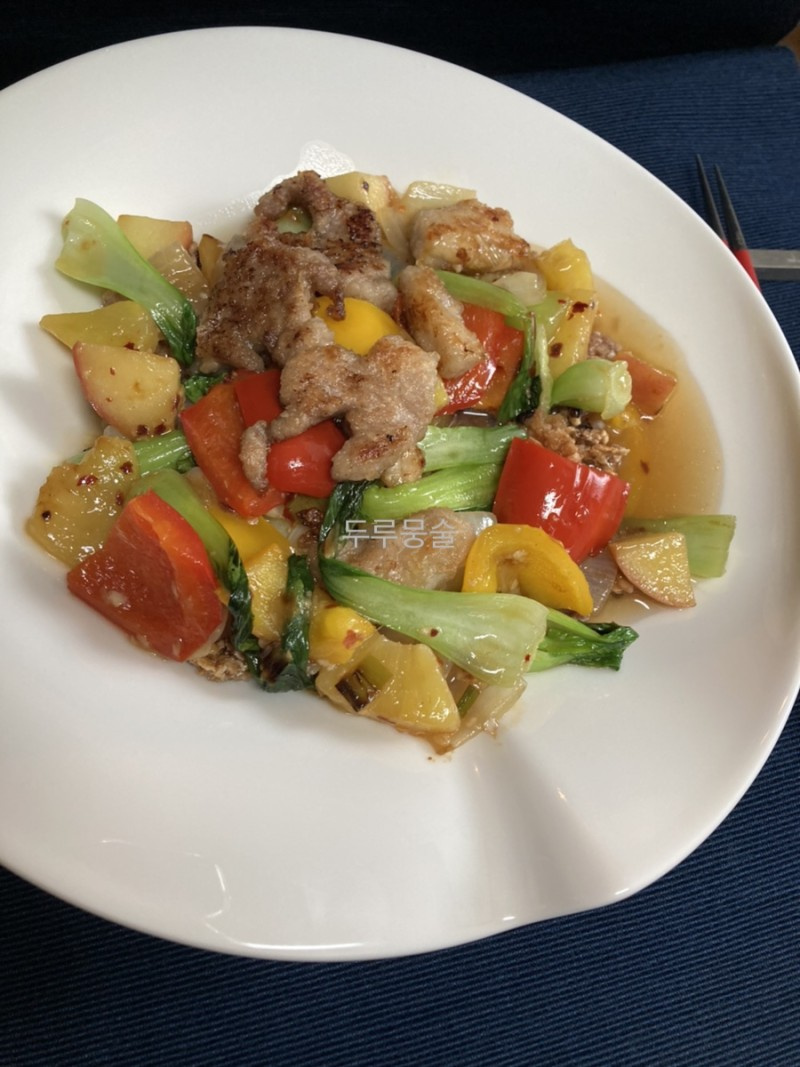 最後に炒めた豚肉を野菜の上に乗せたら完成です!温かいソースが絡まることで、揚げたおこげが少し柔らかくなりつつも、カリッとした食感を同時に楽しめる、おこげの甘酢炒め風(ヌルンジタンス)をぜひ味わってみてください。