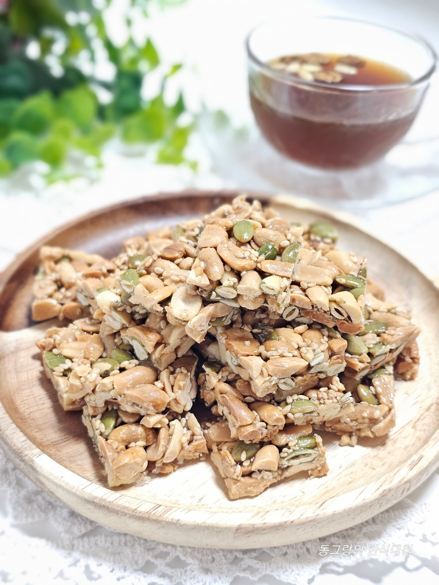 ご家庭で簡単に作れる、香ばしくて甘いピーナッツのおこし(カンジョン)はいかがですか?カボチャの種とごまを加えて、さらに風味豊かで食感も楽しめます。お歳暮やお子様のおやつにも最適です!