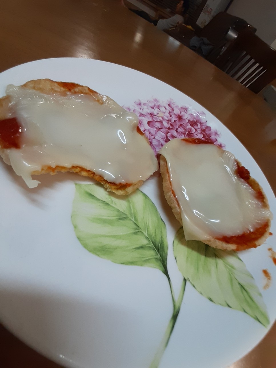 まず、ポン菓子を2個、お皿の上に並べて置きます。これがピザの生地の代わりになります。少し硬くなってしまったポン菓子も、このレシピで美味しく食べられますよ。