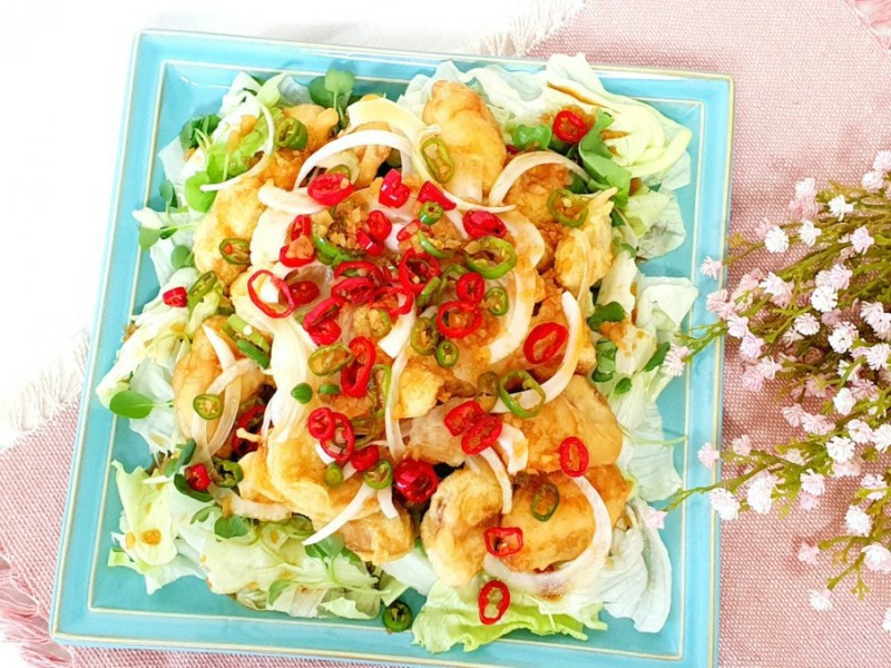 すぐにいただくか、ソースをかけた後、全体を軽く和えて野菜と鶏肉を一緒に頬張ってみてください。甘酸っぱいタレとカリカリの鶏肉の相性が抜群で、最高に美味しいです!
