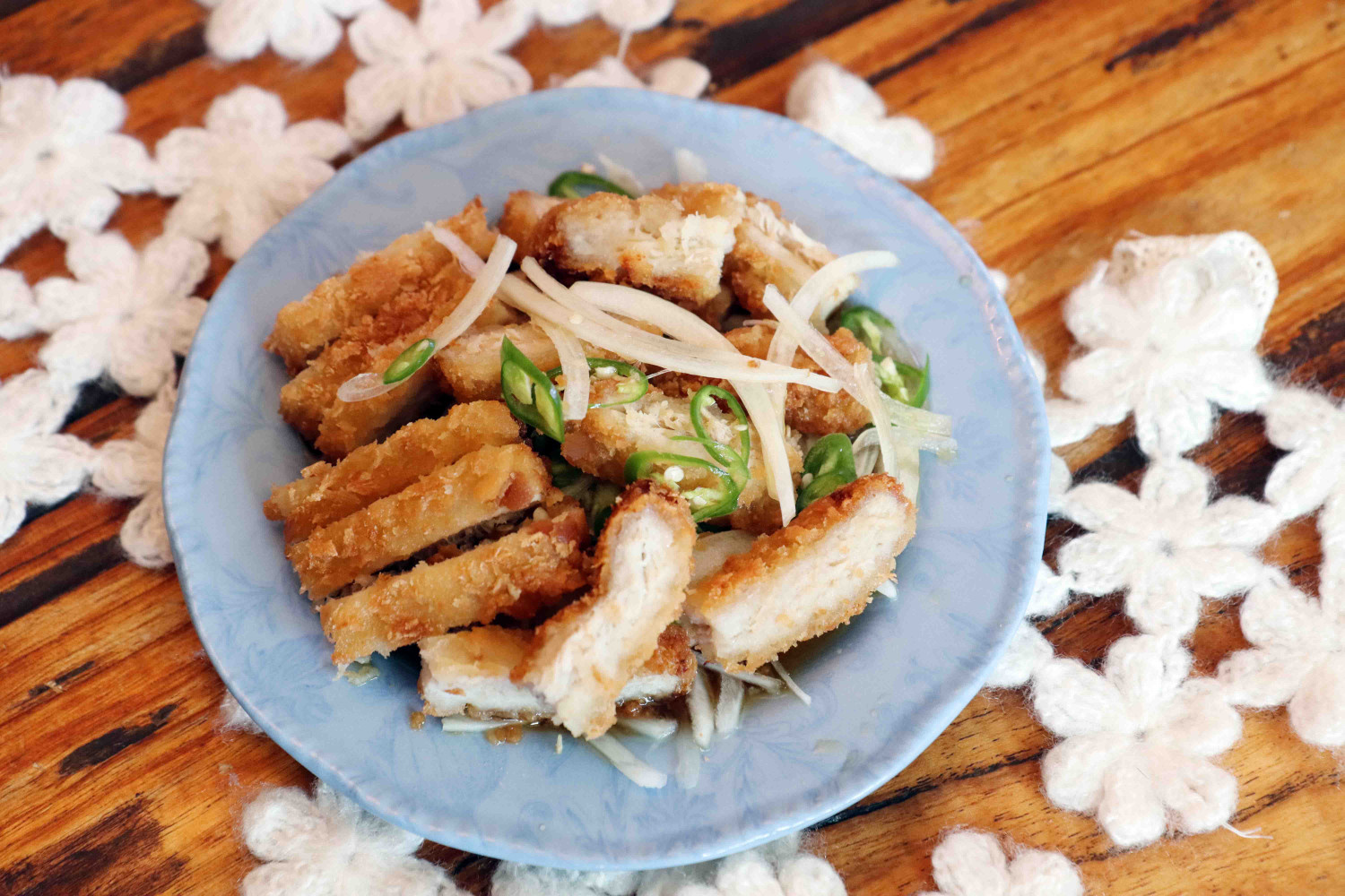 大きめの器に、カットしたとんかつ、水気を切った玉ねぎ、斜め切りにした青唐辛子を彩りよく盛り付けます。作っておいたユーリンチーソースを、お好みの量かけて混ぜ合わせれば完成です。お好みでベビーリーフなどを添えても美味しいですよ。