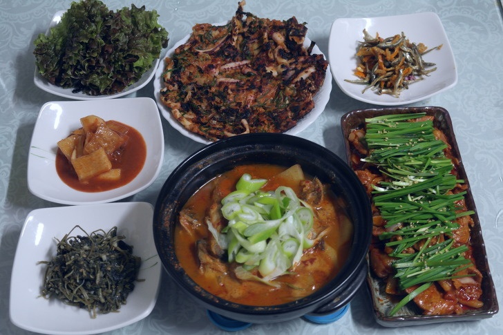 キムチチヂミ、カレイの煮付け、豚肉のプルコギ風炒め:豪華でヘルシーな食卓