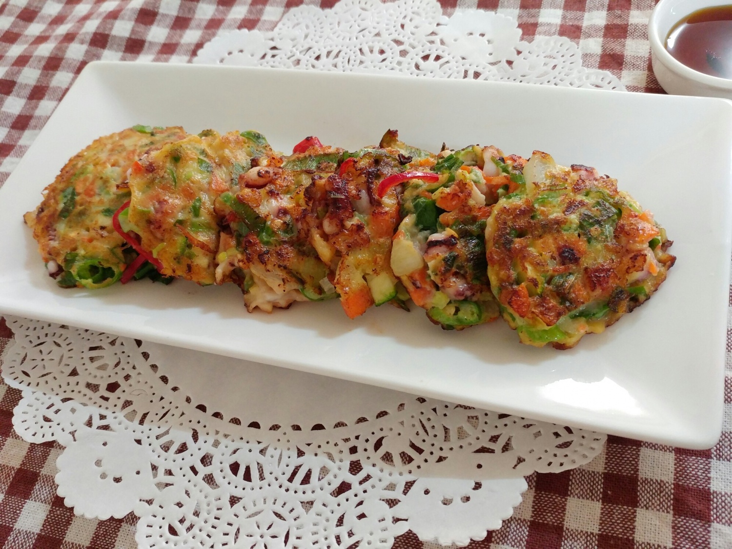 焼き立てのチヂミは、プリプリのイカとシャキシャキの野菜の食感が絶妙で、唐辛子のピリッとした辛さとネギ油の風味が相まって、本当に美味しいです。お好みで、醤油、砂糖、酢を1:1:1の割合で混ぜた万能ダレにつけて食べると、さらに風味豊かに楽しめます。(万能ダレ:醤油大さじ1、砂糖大さじ1、酢大さじ1、水大さじ1)