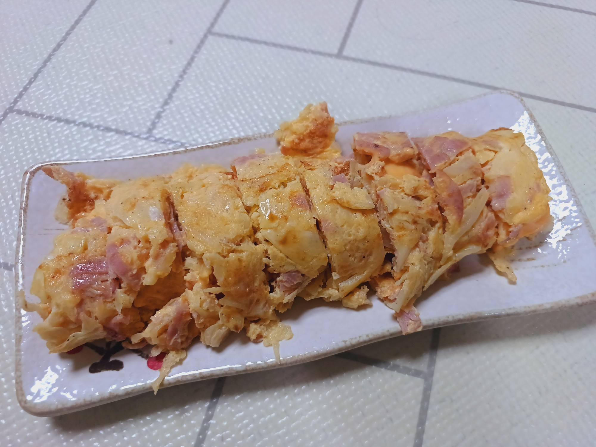 卵に黒こしょうをたっぷり加え、よく溶きほぐしてから、キャベツとハムを混ぜたものに加えて全体が均一になるように混ぜれば、美味しい生地の完成です。生地の濃さは、あまり緩すぎないように調整してください。