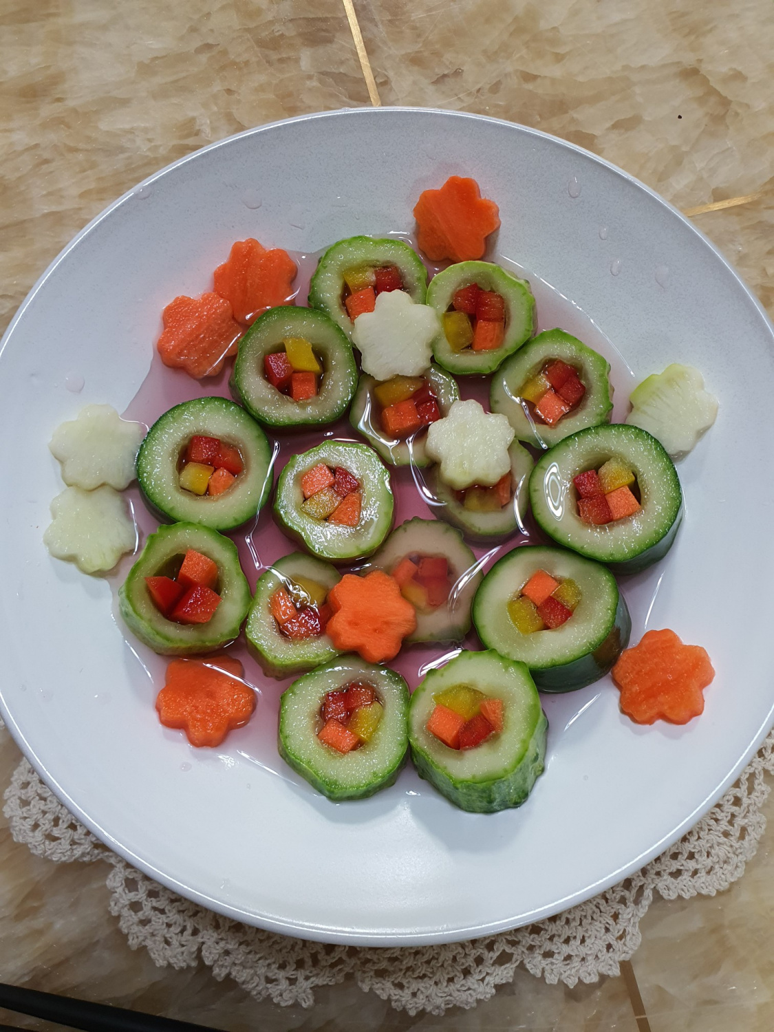 最後に、冷蔵庫に残っている大根と余ったニンジンを活用しましょう。型抜きを使ってきれいな形に抜くと、見た目も楽しいキムチが完成します。こうして完成したキュウリロールキムチは、密閉容器に入れて冷蔵庫で最低2日間熟成させてからお召し上がりください。これにより、素材の味が馴染み、より深く、爽やかな味わいを楽しめます。暑い夏に、ぜひひんやりと召し上がってください!