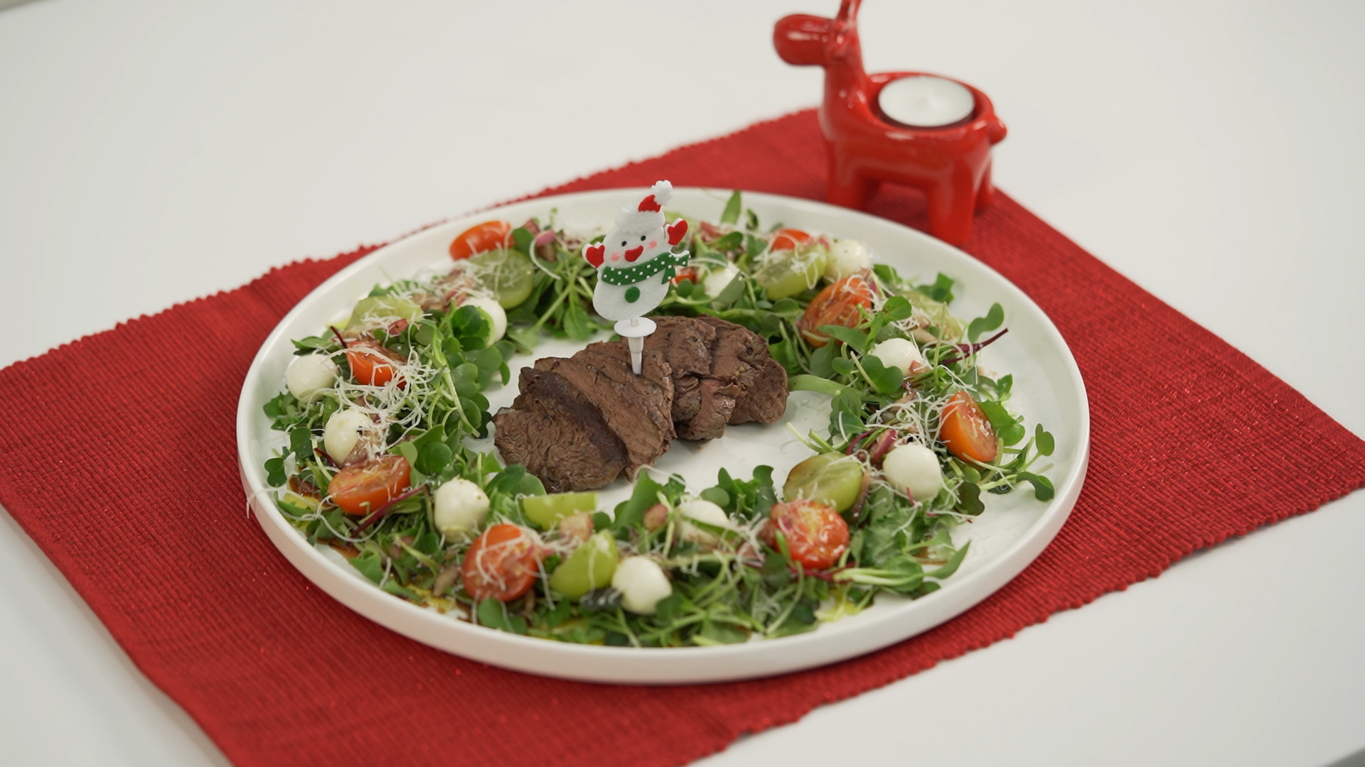 見た目だけでクリスマス気分を盛り上げてくれる特別な一皿です。新鮮なサラダと爽やかなバルサミコドレッシングの組み合わせは、牛ヒレステーキとも完璧に調和します。これからのクリスマスや年末パーティーにぴったりのメニューです。