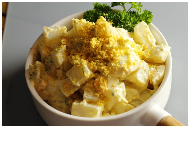 さあ、盛り付けの時間です!出来上がったポテトサラダを器にきれいに盛り付けます。この時、別にとっておいた卵黄をザルなどでこしてサラダの上にパラパラと振りかけると、見た目も美しく、味わいも豊かになります。乾燥パセリフレークや刻んだチャイブを上に散らして飾れば、見栄えの良いポテトサラダの完成です!冷やしていただくと、さらにおいしくなります。
