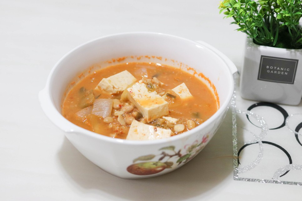 全ての材料が馴染むように、ひと煮立ちさせます。チョングッチャンが程よく溶けたら、準備しておいた豆腐1/2丁を大きめに切って加えます。豆腐に火が通るまでさらに2〜3分煮込めば、香ばしくてコクのあるチョングッチャンチゲの完成です。どうぞ召し上がれ!