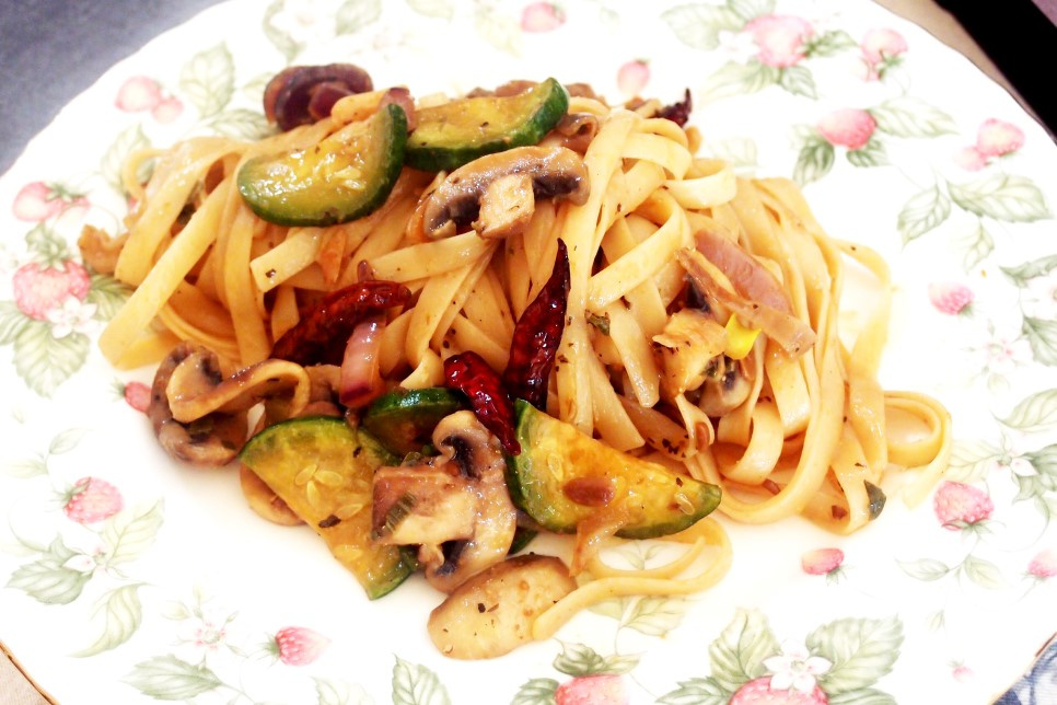 最後に、フライパンで炒めたズッキーニ、マッシュルーム、玉ねぎなどの美味しいソースをパスタの上にたっぷりかけます。これで、クリスマスのパーティーや年末の集まりにぴったりの、韓国風の風味が満載の特別なトジャンフェットチーネパスタの完成です!どうぞ美味しくお召し上がりください!