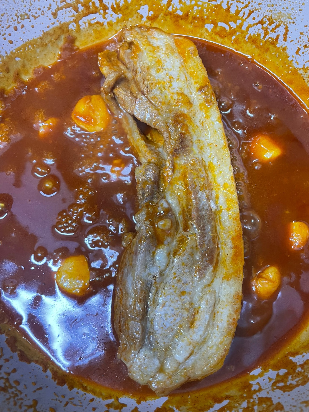 鍋に蓋をして、中火で約20分煮込みます。途中で豚バラ肉を前後ろにひっくり返しながら、タレが均一に染み込むようにしてください。このように煮込むことで、タレが豚肉によく絡みます。