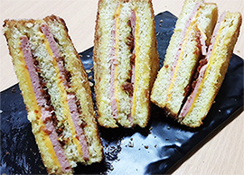次に、サンドイッチを組み立てます。パンの片面にマスタードソースを薄く塗ってください(お好みで省略したり、他のソースに代えてもOKです)。その上にスライスチーズ、スパム、そして先ほど作ったガーリックソースをたっぷりと塗ります。さらにパンを重ねます。この工程を繰り返し、パン→チーズ→スパム→ガーリックソース→パン→チーズ→スパム→ガーリックソース→パンの順に重ねていきます。食パン3枚すべてを使います。