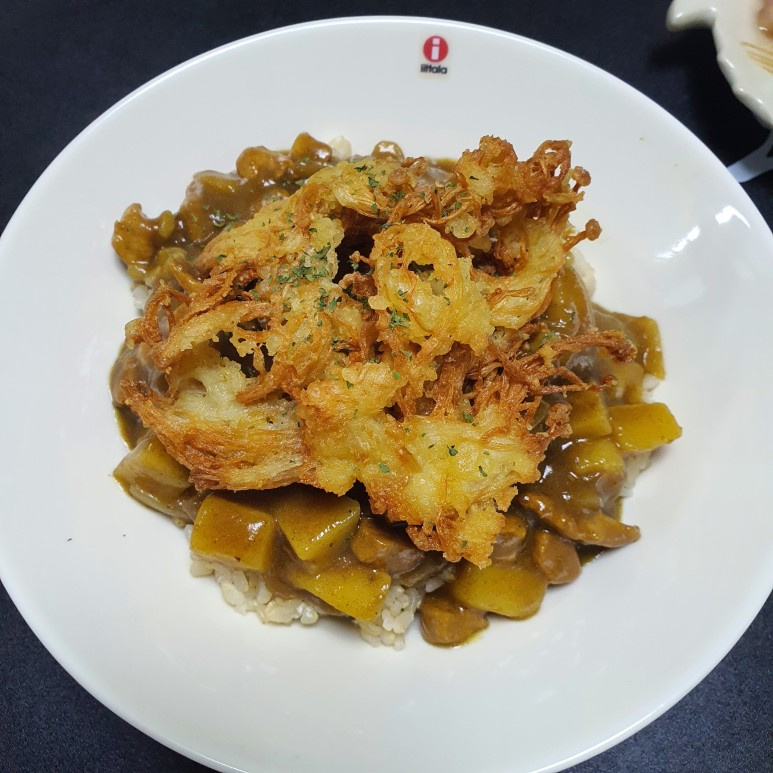 サクサクえのき茸の天ぷらを添えた、特別なカレー丼