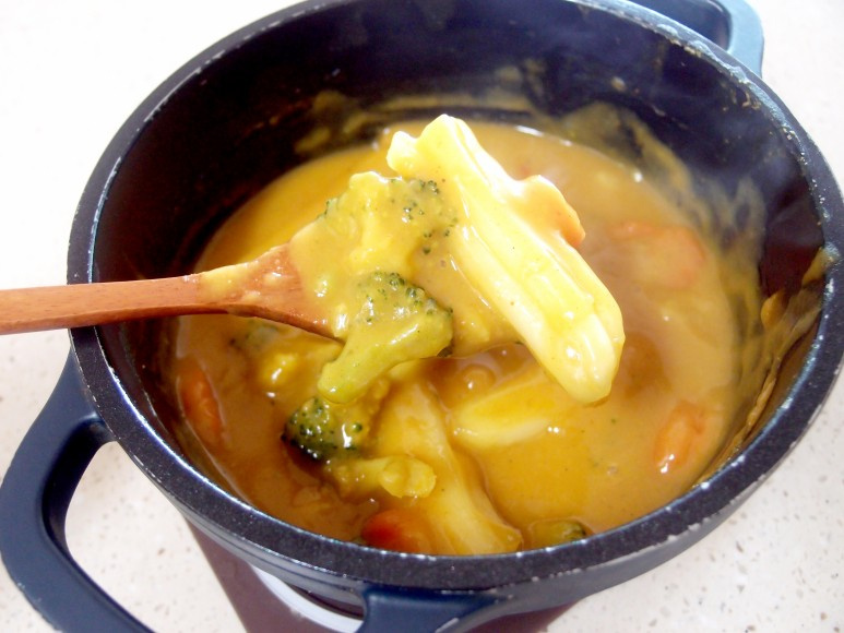 ぐらぐらと沸騰したら、クリームスープの素大さじ2とカレー粉大さじ4を加え、ダマにならないようにしっかり溶かします。強火でひと煮立ちさせた後、弱火にし、焦げ付かないように混ぜながら、ソースにとろみがつくまで煮詰めます。(ソースとして使うため、じゃがいもや玉ねぎは省略しています。)