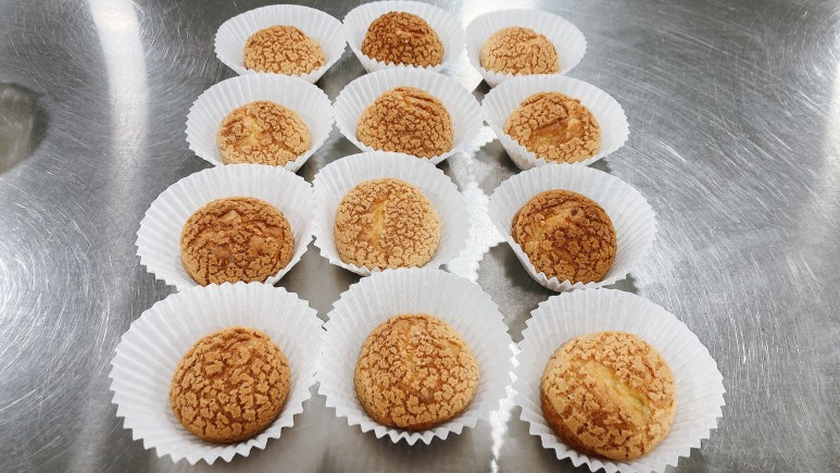 170℃に予熱したオーブンに入れ、170℃で15分焼いた後、温度を150℃に下げてさらに15〜20分焼きます。(オーブンによって調整し、190℃で15分、その後170℃で10〜15分焼く方法もあります。)シューが十分に膨らみ、こんがりと焼き色がついたらOKです。焼いている間は、オーブンのドアを頻繁に開けないように注意してください。