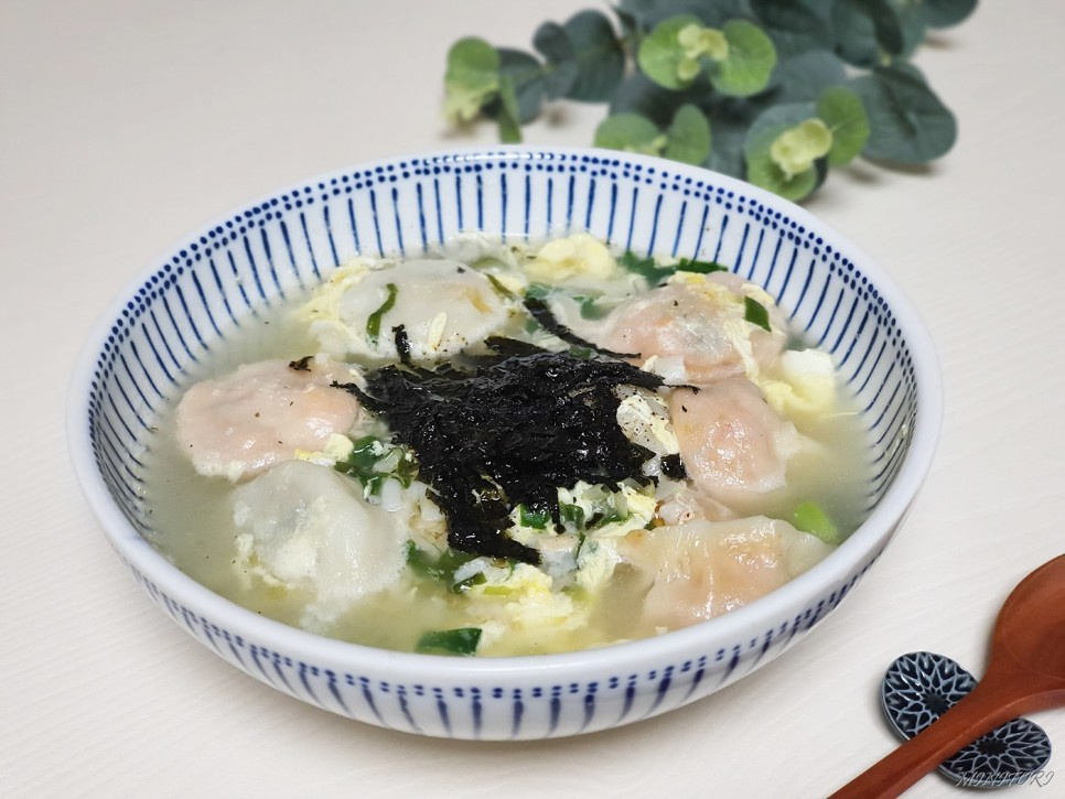 完成したサゴルマンドゥクを、美味しそうに器に盛り付けましょう。仕上げにごま油大さじ1をたらし、こしょう少々と香ばしい刻み海苔を散らせば、本格的なサゴルマンドゥクの出来上がりです。温かい一杯で、心も体も満たされる食事をお楽しみください!