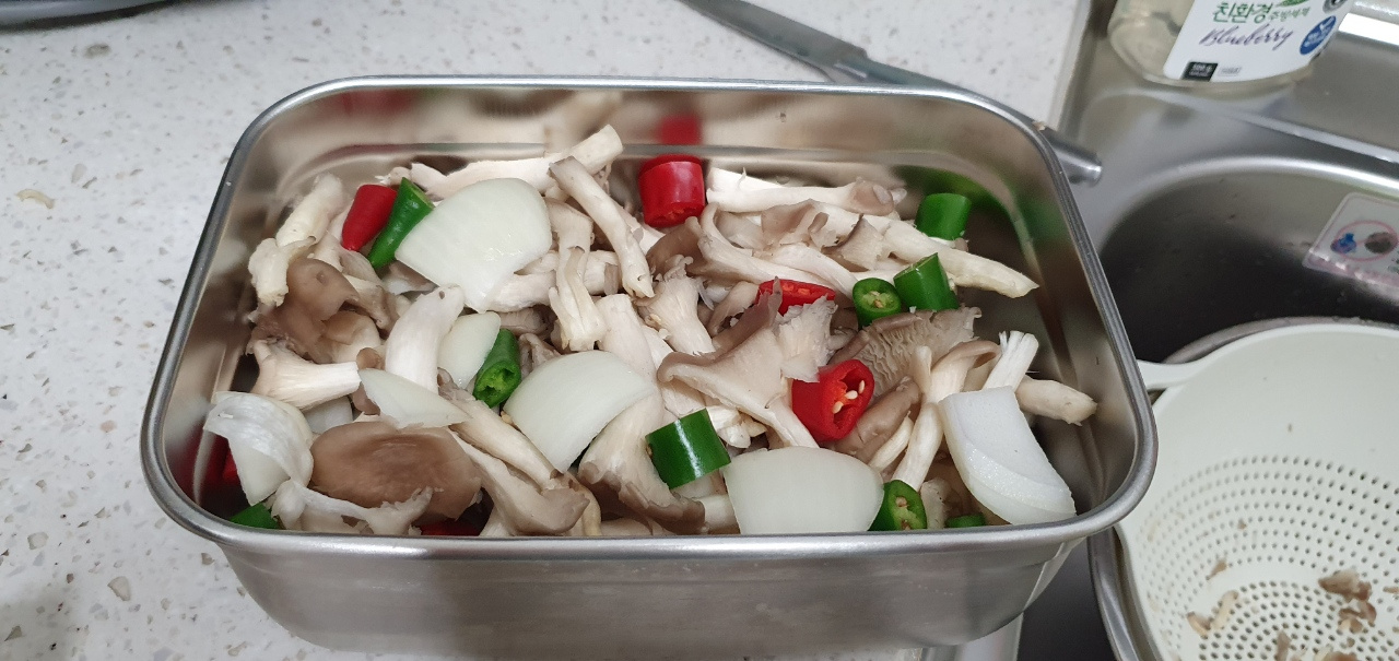 まず、サンタリス茸(またはエリンギ)は、塊になっている部分を軽くほぐし、流水でさっと洗い、水気をしっかりと切ってください。強く洗いすぎると茸が崩れることがあるので注意しましょう。玉ねぎは皮をむき、大きめの角切りにします。ニンニクはきれいに洗い、土だけを取り除きます。長ネギも同様に洗って準備します。辛味をプラスする青唐辛子と、彩りを添える赤唐辛子は、きれいに洗った後、約2cmの長さに切ってください。
