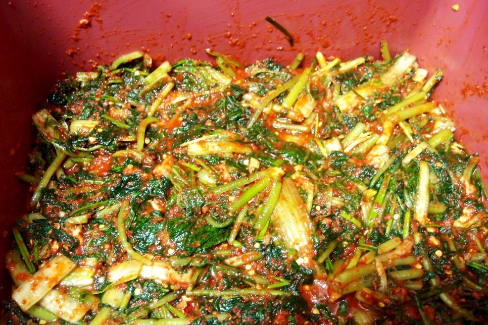 水気を切ったヨルムとオルガリに、あらかじめ作って熟成させたキムチのヤンニョムをすべて加えます。準備したニラ1/2束(なければ省略可)も適当な大きさに切って一緒に加えます。