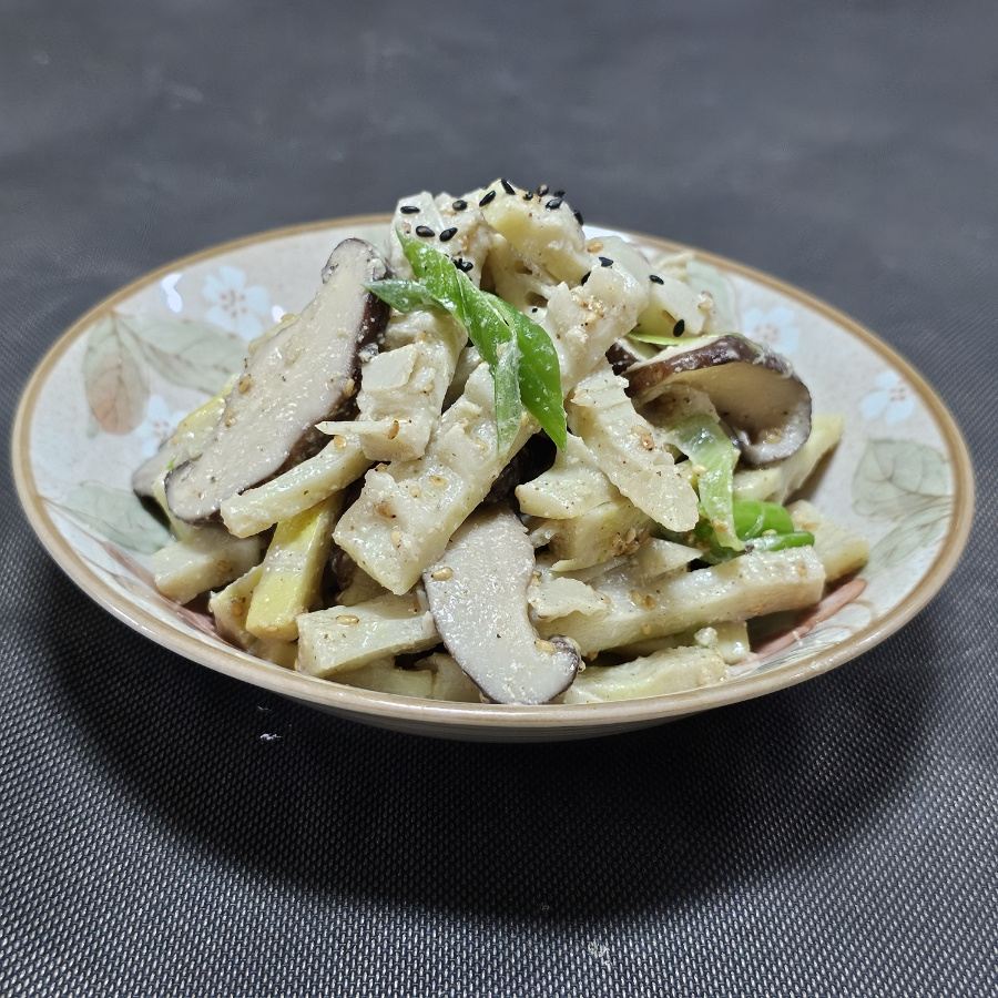 香ばしいすりごまと風味豊かな炒りごまが合わさって、美味しくないはずがありません!たっぷりと皿に盛り付ければ、ご飯が何杯でも進む、素晴らしいおかずが完成します。シャキシャキとしたタケノコと、柔らかくも歯ごたえのある椎茸の絶妙な食感と風味をお楽しみください。