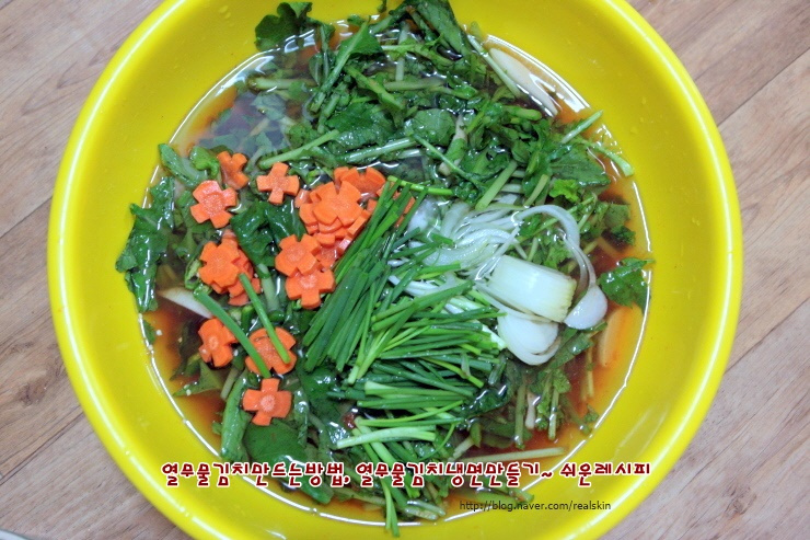 塩漬けしたヨルムに、作ったヤンニョムと準備した野菜を全て加え、優しく混ぜ合わせます。強く混ぜすぎるとヨルムが潰れてしまうので注意してください。ここで再度味見をし、足りない場合は塩や魚醤で調整します。もし水分が足りないと感じたら、水を少し加えて汁の量を調整してください。