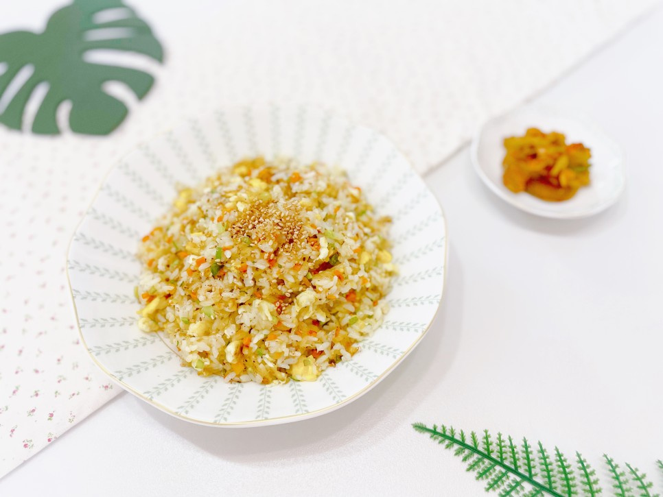 完成したきゅうりチャーハンをお皿にきれいに盛り付けます。最後に香ばしさを加える白ごまをパラパラと振りかければ、見た目も楽しく、味も満足のいくきゅうりチャーハンが完成です。爽やかな香りとシャキシャキの食感をお楽しみください!