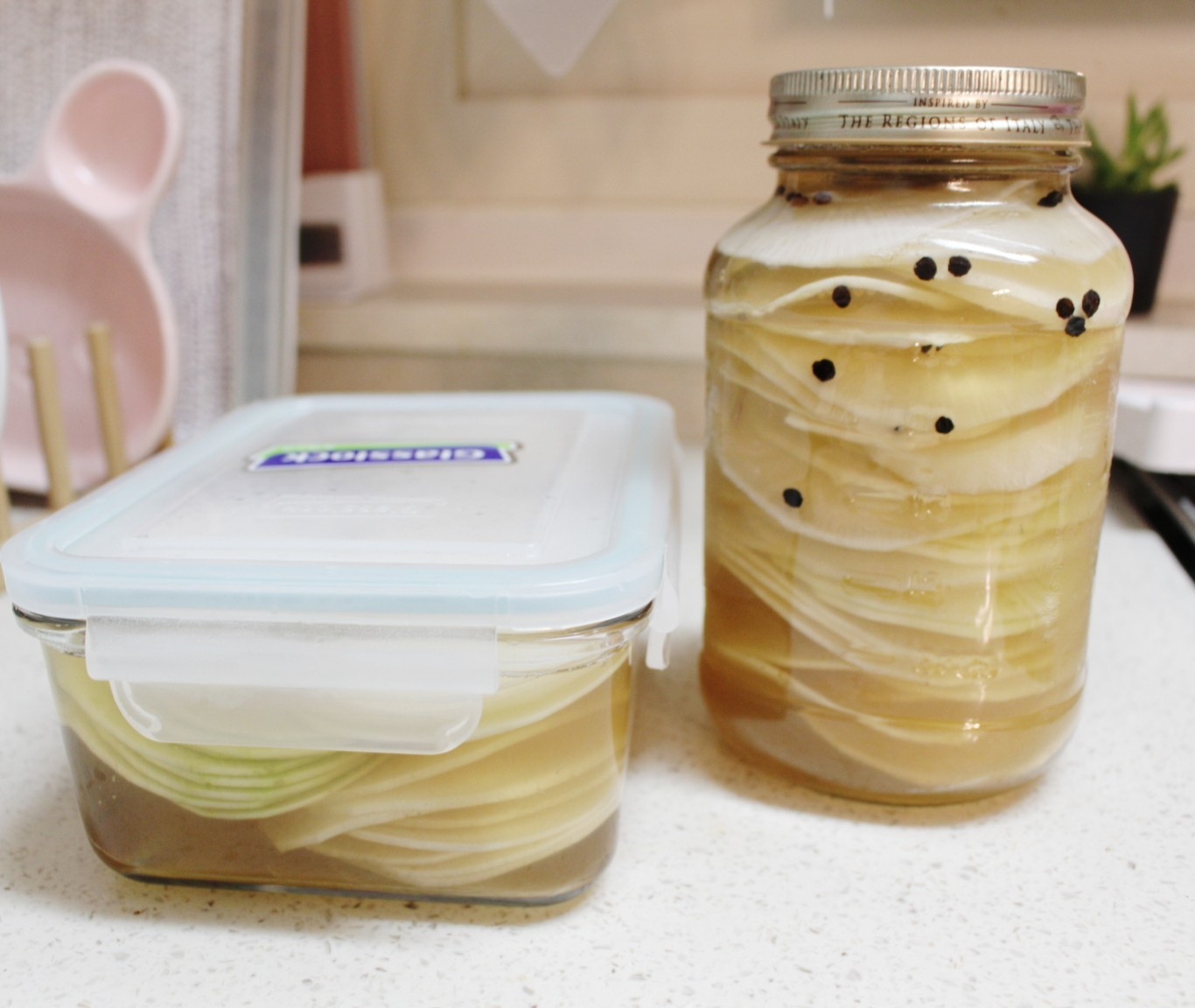 温かい漬け液(ピクルス液)を、大根が完全に浸かるまで瓶に注ぎ入れます。熱い液を注ぐことで、大根がしっかりと漬かり、保存性も高まります。蓋をしっかり閉めて密閉し、粗熱が取れたら冷蔵庫で保存してください。一晩ほど置くと、味が馴染んで美味しくいただけます。