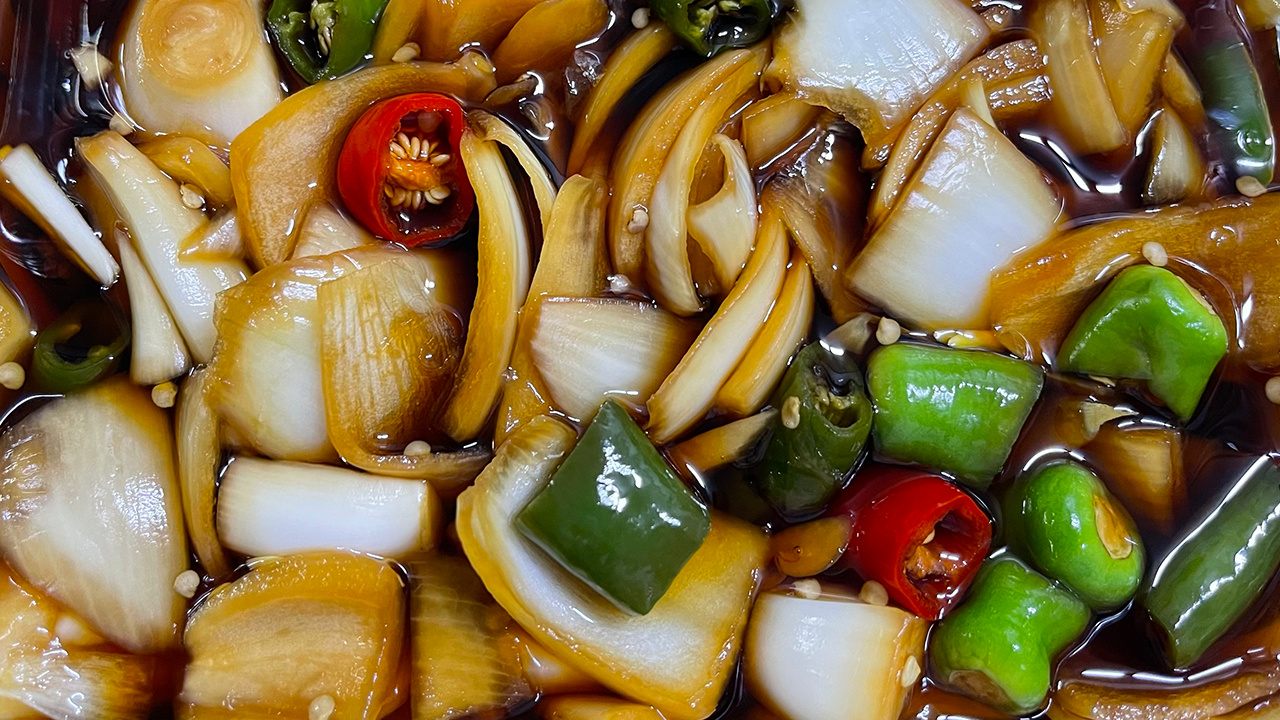 準備した容器に、切った玉ねぎと唐辛子を入れ、熱く煮て冷ましたタレを注ぎます。タレが野菜全体を十分に覆うようにしてください。このようにして作った玉ねぎのピクルスは、涼しい場所で約12時間ほど漬け込むと、シャキシャキとして美味しい甘酸っぱくしょっぱい玉ねぎのピクルスが完成します!残ったタレは冷蔵庫で保存し、いつでもお召し上がりください。