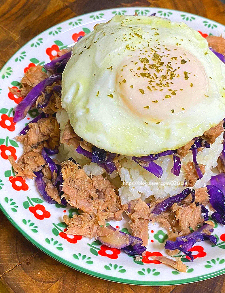 器にご飯を適量盛り、今炒めた美味しい紅キャベツとツナの炒め物をご飯の上にたっぷりと乗せます。お好みで目玉焼きなどを添えると、さらに豊かな風味を楽しめます。どうぞ召し上がれ!