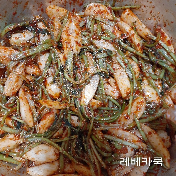 攪拌したエビのタレと、残りの準備したタレをデーツ(大根)に加え、すべての材料が均一に混ざるように、美味しく和え上げます。手で優しく揉み込むように和えると、タレが大根によく染み込みます。