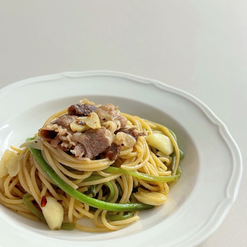 シャキシャキ茎わかめと牛バラ肉のパスタ