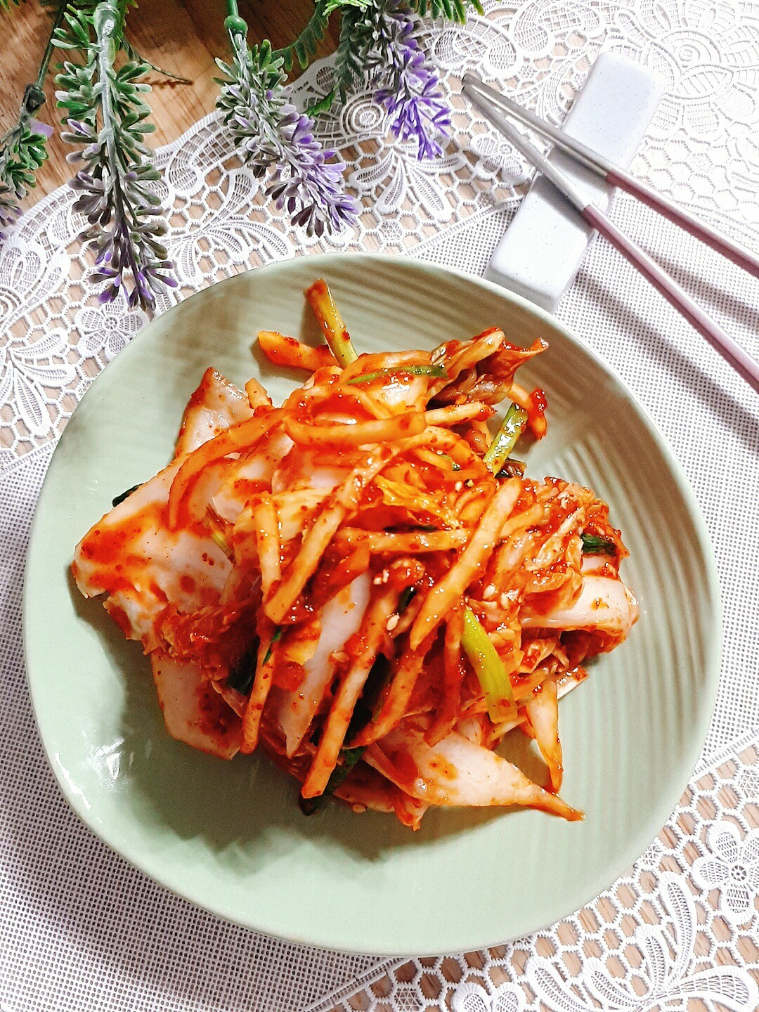 最後に、水気をしっかりと切った白菜を、調味料で和えたコールラビとニラの上に加えて、優しく混ぜ合わせます。強く揉みすぎると白菜が潰れてしまう可能性があるので注意してください。こうして、シャキシャキとして甘みのあるコールラビがたっぷり入った美味しい白菜キムチの完成です!「食は米にあり」と言いますが、まさに韓国人の力の源ですね!たっぷり作って、ご家族皆さんで美味しい食卓をお楽しみください!