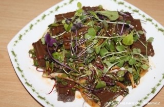 シャキシャキ食感!ヘルシーなドトリムッ(どんぐりこんにゃく)と新芽の和え物