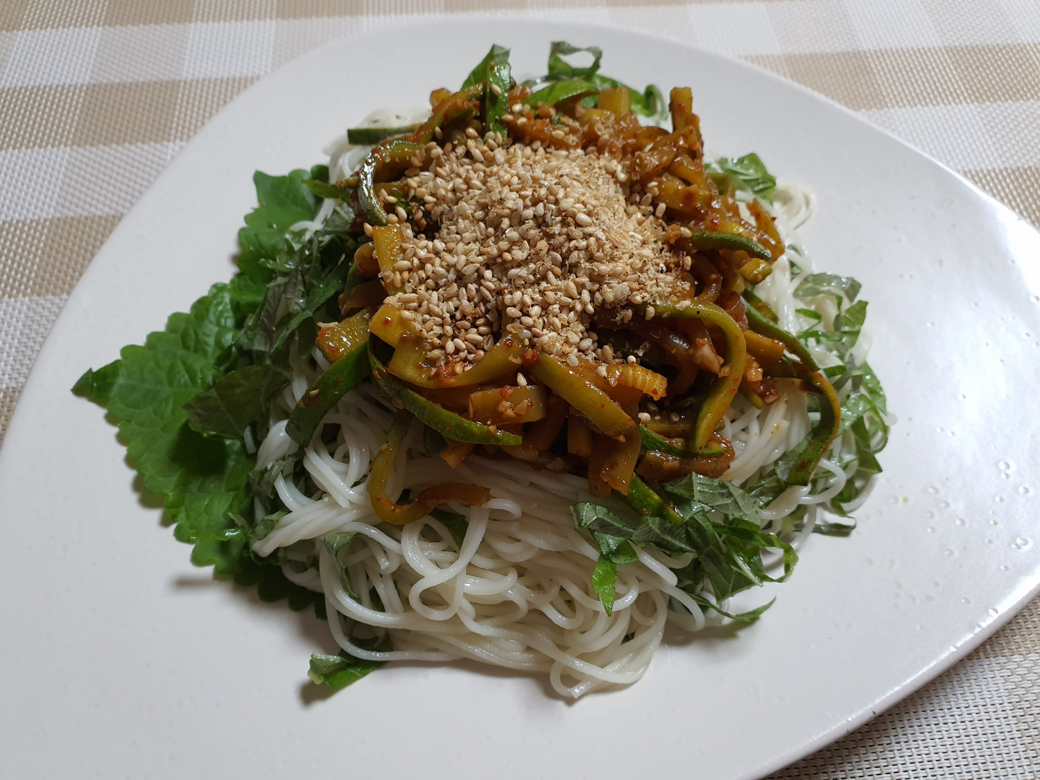 出来上がった麺を器にきれいに盛り付けます。その上に、少し冷ました美味しいズッキーニ炒めをたっぷりとのせます。最後に、あらかじめすりおろしておいた香ばしい炒りごま大さじ3をたっぷりとかければ、見た目も楽しく食欲をそそる忠清道式ズッキーニビビンククスの完成です。どうぞお召し上がりください!