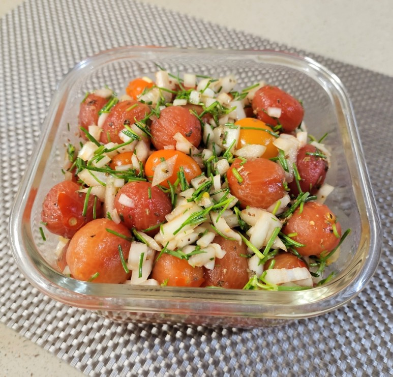 4. 野菜の水気を切り、刻む:皮をむいたミニトマトは、しっかりと水気を切っておきます。準備した玉ねぎは皮をむき、水気を切ってから、ミニトマトと同じくらいの大きさに細かく刻んでください。あまり大きく切ると味が染み込みにくくなるので、できるだけ細かく切るのがコツです。