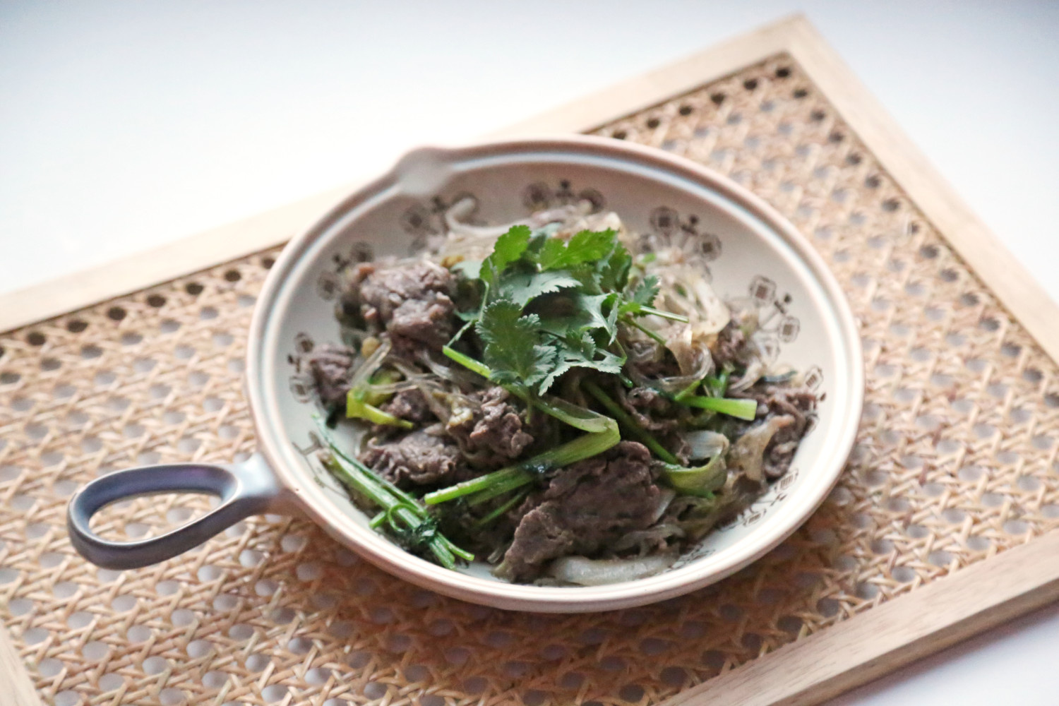 春雨は熱湯に10分ほど浸して戻します。戻した春雨は水気を切り、肉がほぼ焼けたらフライパンに入れて一緒に炒めます。春雨がタレを吸って、さらに美味しくなります。春雨が硬すぎる場合は、炒める前に軽く茹でてから使っても良いでしょう。