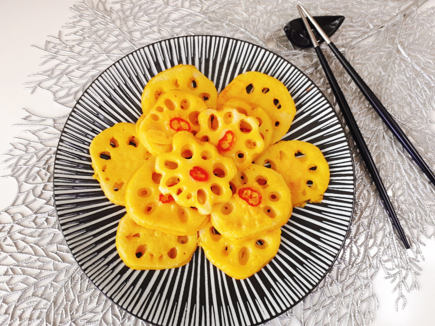 れんこんは皮をきれいにむき、厚さ約0.5cmの、あまり薄すぎないように切ります。厚さを均一に切ると、火を通したときに食感が均一になります。(ヒント:形を整えたい場合は、れんこんの両端を軽く押して丸い形にしてください。私は形を作るのが少し手間だったので、2枚だけ面白半分で作ってみました!)